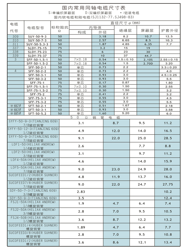 国内常用同轴电缆尺寸表
