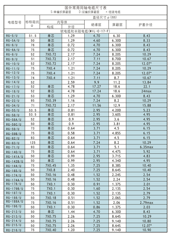 国内常用同轴电缆尺寸表